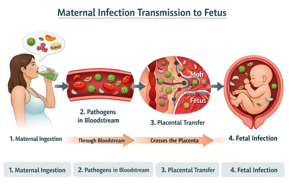 Listeria from unpasteurized milk can enter the mother’s bloodstream, cross the placenta, and infect the fetus. This process is a known cause of newborn death linked to raw milk pregnancy exposure.