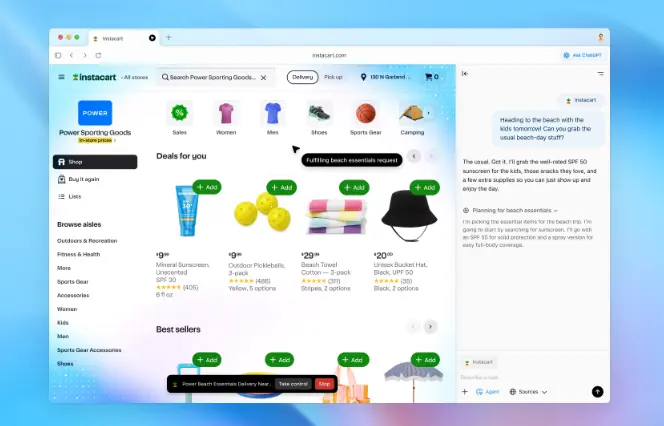 Atlas introduces Agent Mode, a premium feature for Plus and Pro subscribers. In this mode, ChatGPT goes beyond text and executes actions in the browser.